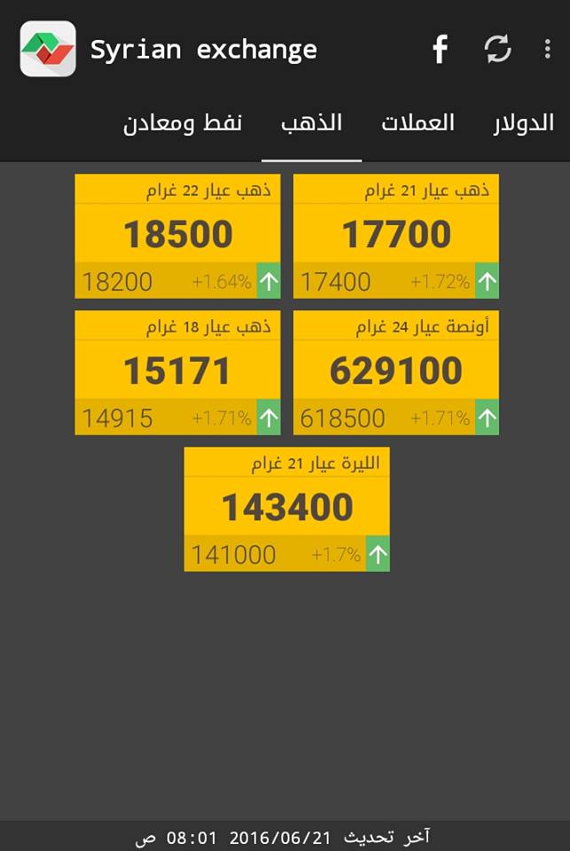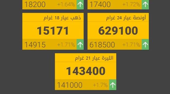 وبقي غرام الـ 21 ذهب، بـ 17700 ليرة، كما بقي غرام الـ 18 بـ 15171 ليرة، وذلك حسب "التسعيرة الرسمية" الصادرة عن جمعية الصاغة بدمشق.
