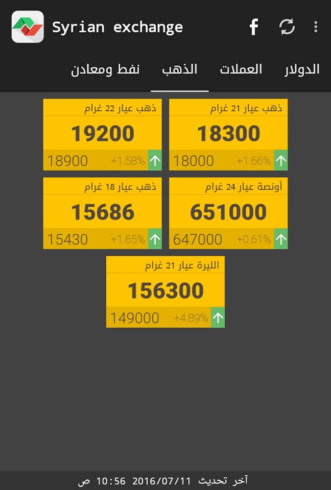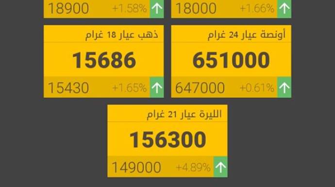وبقي غرام الـ 21، بـ 18300 ليرة، كما بقي غرام الـ 18 بـ 15686 ليرة، وذلك حسب "التسعيرة الرسمية" الصادرة عن جمعية الصاغة بدمشق.