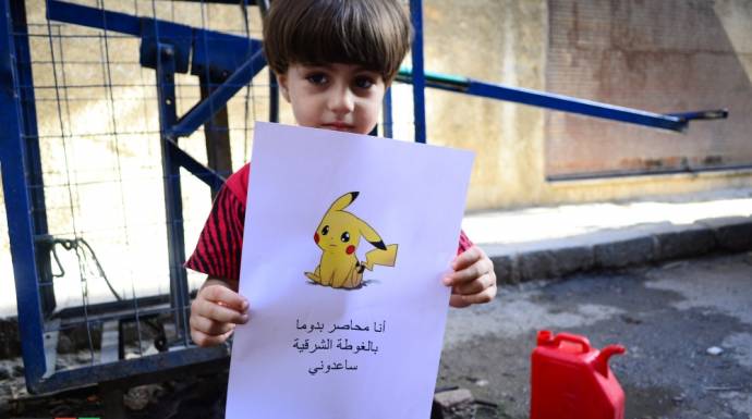 ورفع طفل رسما لشخصية "بيكاتشو" في "بوكيمون" وعليها عبارة تقول إنه محاصر في دوما بالغوطة الشرقية ويطلب المساعدة.