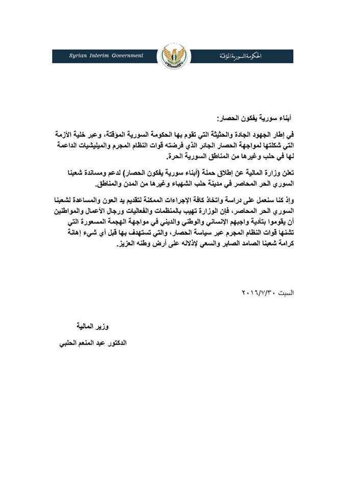 أطلقت وزارة المالية في الحكومة السورية المؤقتة حملة تحت عنوان "أبناء سورية يفكون الحصار"، بهدف مساندة ودعم السوريين المحاصرين في شرق حلب، وغيرها من المدن والمناطق السورية.
