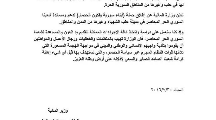 مالية "المؤقتة" تطلق حملة لدعم المحاصرين شرق حلب