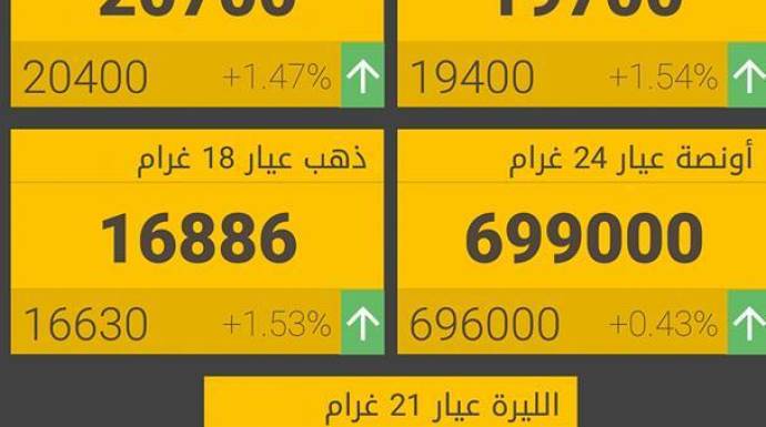 وبقي غرام الـ 21 ذهب، بـ 19700 ليرة، كما بقي غرام الـ 18 بـ 16886 ليرة.
