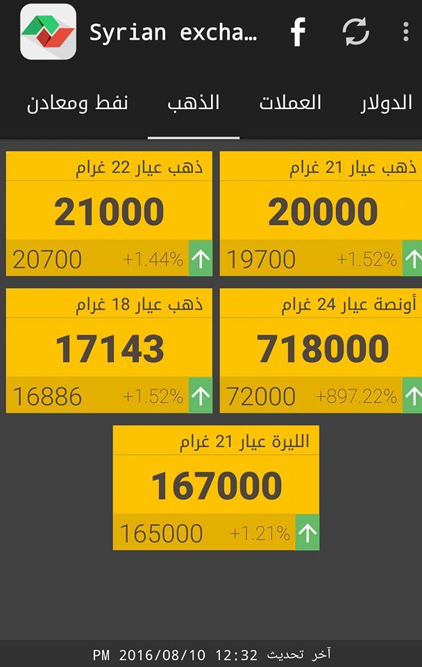 وارتفع غرام الـ 21 ذهب بدمشق، 300 ليرة، ليصبح بـ 20 ألف ليرة، فيما أصبح غرام الـ 18 بـ 17143 ليرة.