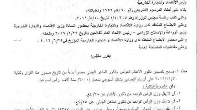وبحسب القرار، فإن التصدير سيتم أسبوعياً بواقع 6000 رأس، مقابل إستيفاء رسوم على كل رأس يتم تصديره لصالح المتضررين من مربي الثروة الحيوانية.