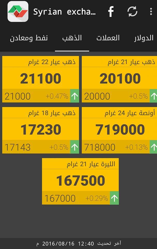 وارتفع غرام الـ 21 ذهب، 100 ليرة، ليصبح بـ 20100 ليرة، فيما ارتفع غرام الـ 18 إلى 17230 ليرة.