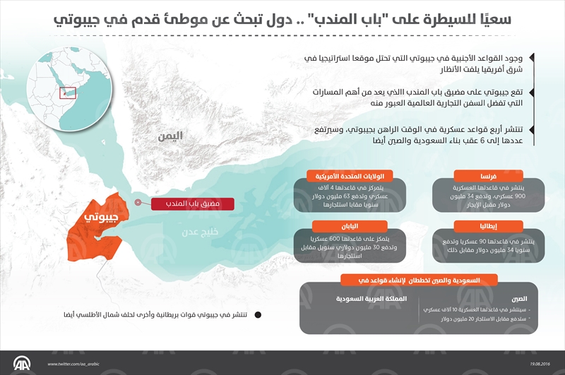 تتسابق دول حول العالم على إنشاء قواعد عسكرية لها في جيبوتي، نظراً لموقعها الاستراتيجي والجغرافي الواقع على الشاطئ الغربي لمضيق باب المندب، الواصل بين البحر الأحمر وبحر العرب.