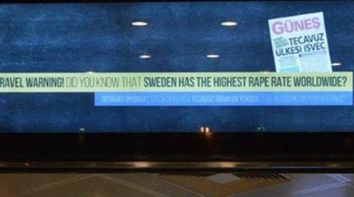 يقول الإعلان باللغتين التركية والإنجليزية "تحذير من السفر! هل تعلم أن السويد بها أعلى معدل اغتصاب في العالم؟"
