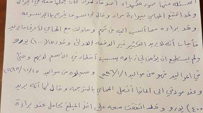 وتقول أنها عرضت على المحامي أدلة براءة مراد من صور صفحات جواز سفره، وعليها تاريخ خروجه من سوريا بتاريخ 12/1/2013.
