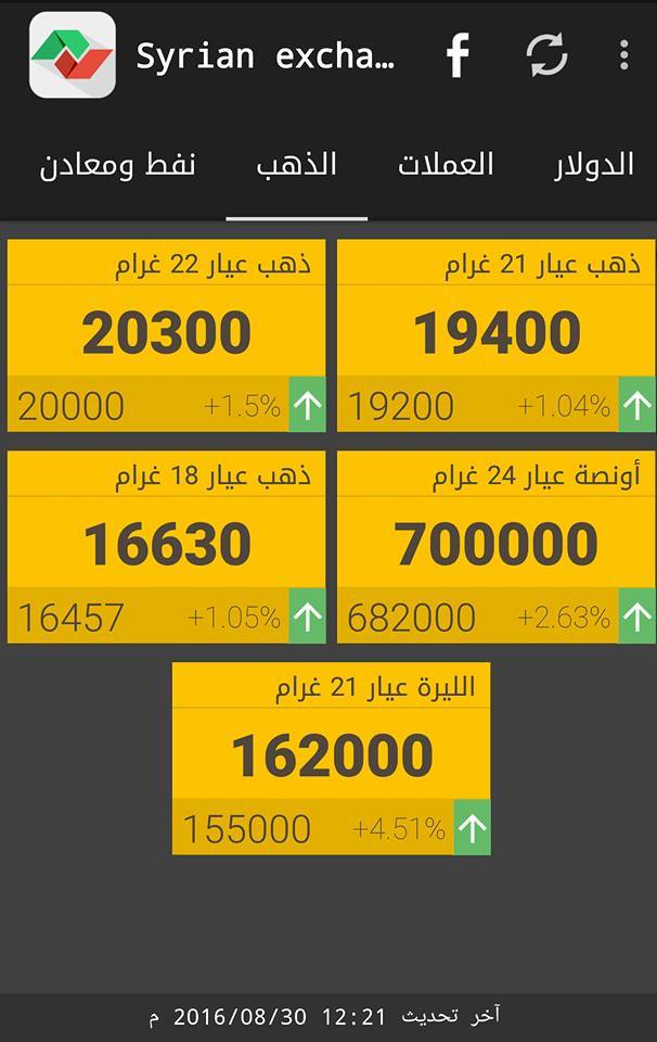 ارتفع غرام الـ 21 ذهب، 200 ليرة، في دمشق، اليوم الثلاثاء، حسب "التسعيرة الرسمية" الصادرة عن جمعية الصاغة.