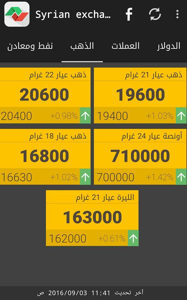 ونوهت جمعية الصاغة بدمشق إلى أنها اعتمدت سعر الأونصة العالمي، 1326 دولار، في تقدير سعر غرام الذهب محلياً.