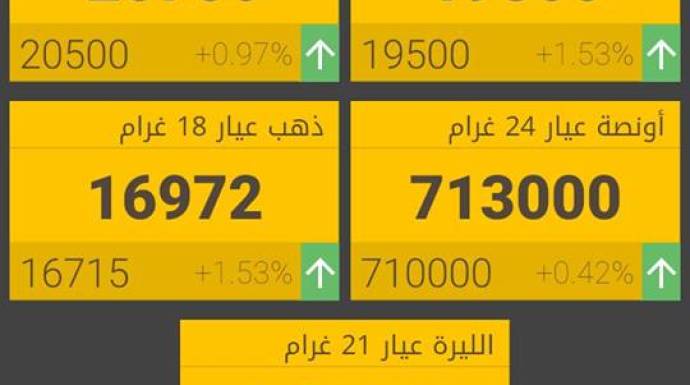 وارتفع غرام الـ 21 ذهب، 300 ليرة، ليصبح بـ 19800 ليرة، فيما أصبح غرام الـ 18 بـ 16972 ليرة.