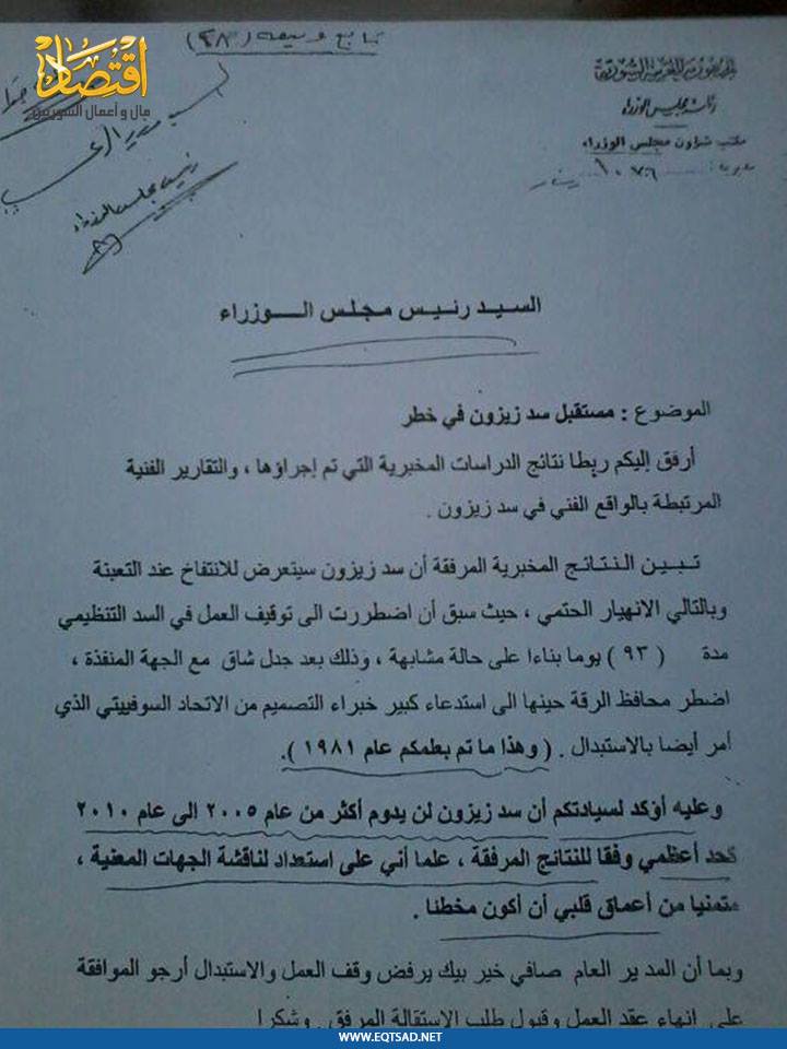 في العام 1994 تم تكليفي من قبل رئيس الوزراء محمود الزعبي، للإشراف على بناء سد "زيزون"، بعد مضي أقل من شهرين على بدء العمل قدمت تقريري لرئاسة الوزراء، بأن هناك سرقات من مواد بناء السد، وقلت لهم إن السد سينهار في العام 2004 على أكثر تقدير، وهذا مرفق بالوثائق، لكنهم لم يصغوا لكلامي، وذلك لأن المدير العام للسد صافي خير بك، كان قريباً للواء محمد ناصيف خير بك، معاون نائب رئيس الجمهورية، وحينها قدمت استقالتي وقلت لهم وعلى وجوه الأشهاد، "لن أقبل أن أكون شاهد زور"، وبالفعل انهار السد في العام 2002 مخلفاً كوارث حينها.