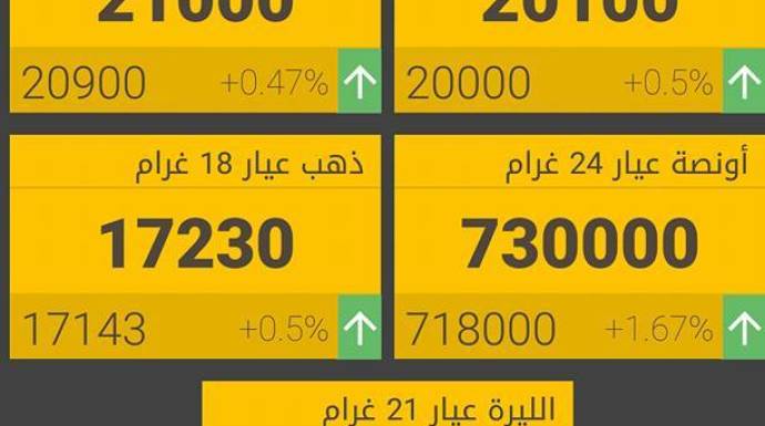 وأصبح غرام الـ 21 ذهب بـ 20100 ليرة، فيما أصبح غرام الـ 18 بـ 17230 ليرة.