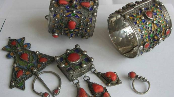 ومن هذه المهن، صناعة الفضة، التي تشمل المشغولات الفضية المتعلقة بالحلي النسائية كالقلادات والأقراط والأحزمة والخواتم والخلاخل، والأساور والمكاحل وغيرها.