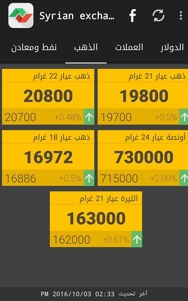 لم تُصدر جمعية الصاغة بدمشق، اليوم الاثنين، سعراً جديداً للذهب، فبقي الأخير على نفس أسعاره الصادرة يوم السبت.
