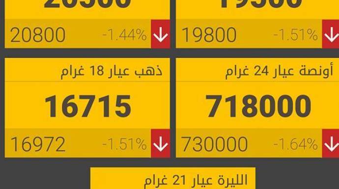 وخسر غرام الـ 21 ذهب، 300 ليرة، ليصبح بـ 19500 ليرة، فيما أصبح غرام الـ 18 بـ 16715 ليرة.