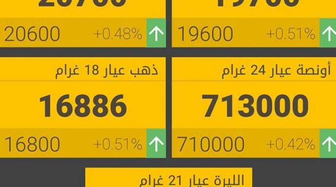 وحسب الجمعية، بات سعر غرام الـ 21 ذهب، بـ 19700 ليرة، بارتفاع 100 ليرة، فيما بات غرام الـ 18 بـ 16886 ليرة.