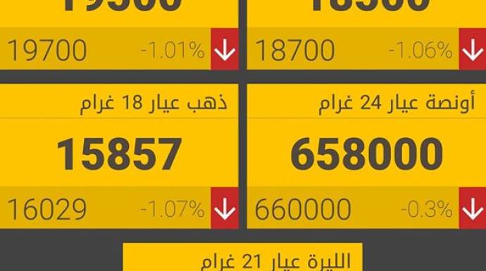وبناء عليه، خسر غرام الـ 21 ذهب، 200 ليرة، ليصبح بـ 18400 ليرة شراء، 18500 ليرة مبيع.