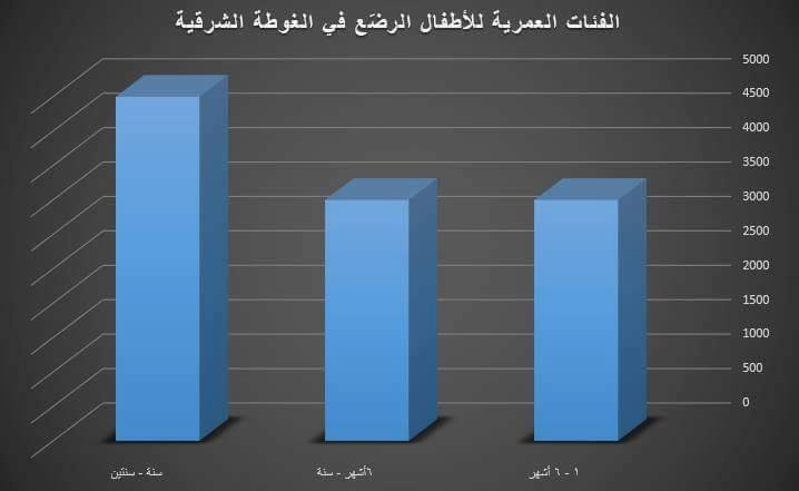 ويقدر عدد الأطفال الذين هم بحاجة إلى الحليب الصناعي في الغوطة الشرقية حوالي 12000 طفل وفقاً لإحصائيات استطاع موقع "اقتصاد" الحصول عليها من إدارة تنسيق العمل الإغاثي في الغوطة الشرقية موزعين حسب الفئات العمرية وفق المخطط التالي: