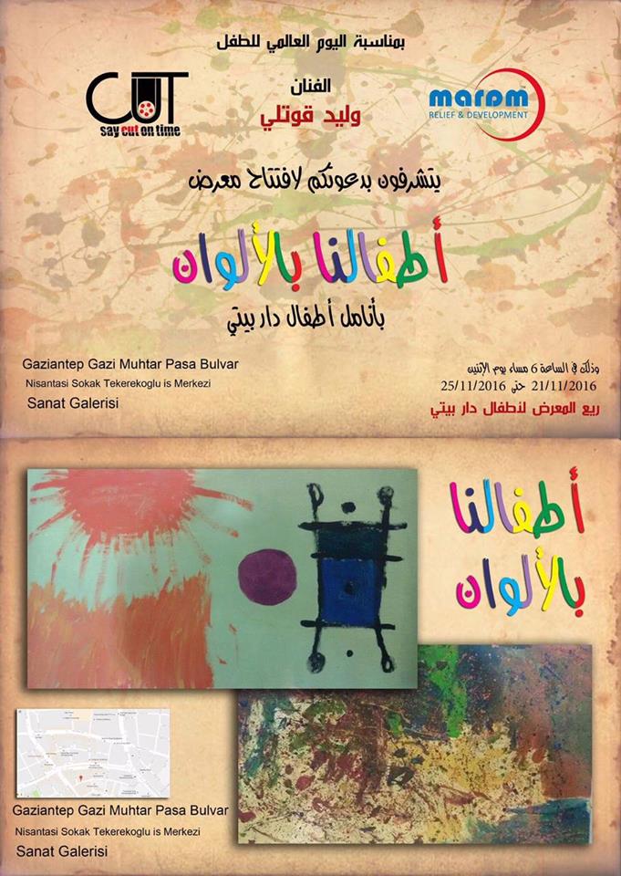 نظمت معرض "أطفالنا بالألوان"، منظمتا "مرام" و "كات أكاديمي" بالتعاون مع الفنان وليد قوتلي، الذي أشرف على رسومات الأطفال وحرص على أن تكون معبرة بعفوية عما يجول في خواطرهم.