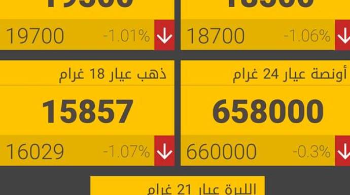 كما بقي غرام الـ 18 بـ 15757 ليرة شراء، 15857 ليرة مبيع.