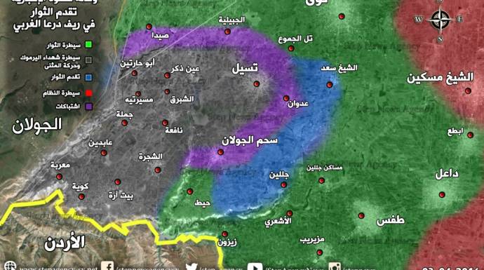 ويعيش مواطنو حوض اليرموك في ريف درعا الغربي حالة من الترقب والانتظار لمعركة وشيكة الحدوث، بين الجيش الحر من جهة، وبين جيش خالد بن الوليد، من جهة أخرى، والتي بدأت بوادرها الجدية صباح يوم الثلاثاء بتبادل شديد للقصف بالأسلحة الثقيلة.