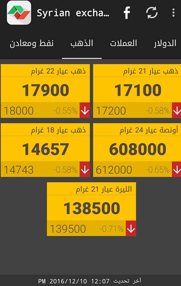ويأتي تراجع الذهب في سوريا بدفعٍ من تراجع نوعي في سعر الدولار محلياً، تزامناً مع تراجع نوعي في سعر الذهب العالمي الذي سجل أدنى مستوياته في عشرة أشهر، يوم أمس الجمعة.