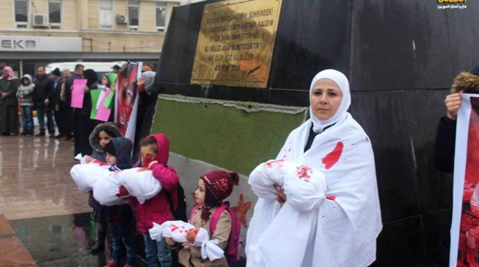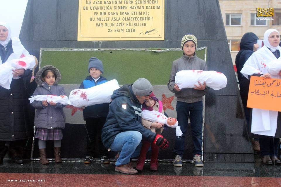 نظم المئات من اللاجئين السوريين، يوم الثلاثاء، اعتصاماً صامتاً في ساحة الاستقلال في مدينة كيليس التركية، كان قد دعى إليه مركز "كريمات"، تنديداً بالجرائم والمجازر التي يرتكبها النظام في مدينة حلب.
