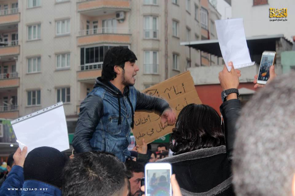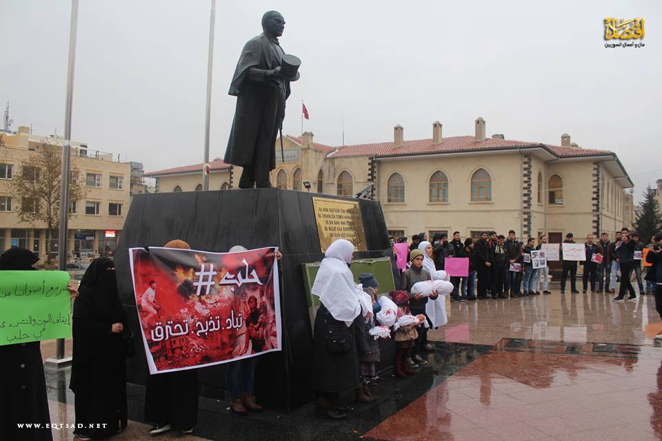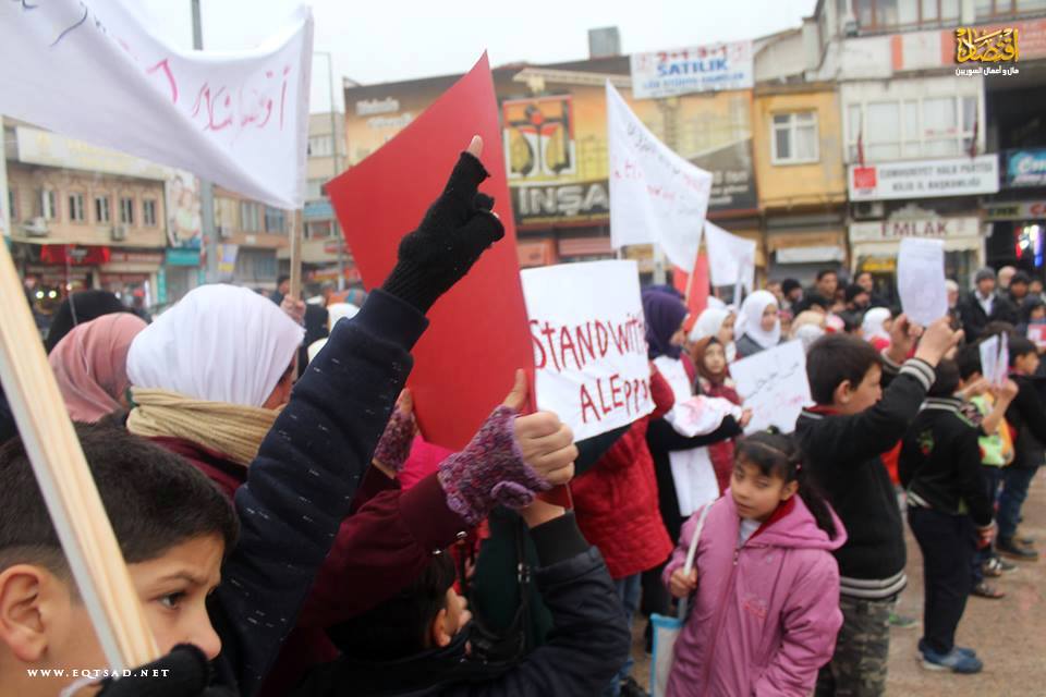 ورفع المعتصمون لافتات نددت بالصمت الدولي حيال ما يجري في مدينة حلب، من جرائم إبادة بحق سكانها، دون تمييز بين أطفال ونساء ورجال.
