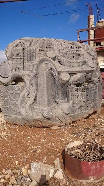 وأضاف أن من أبرز أعماله النحتية لوحات فنية على صخرة تزن ستة أطنان، نحت عليها قصص الأنبياء عليهم السلام، استغرق العمل فيها أكثر من ست سنوات، ونحت عليها قصة النبي يوسف وإدريس، ومدن صالح، وقبائل عاد وثمود وأهل الكهف، وغيرها من لوحات، وهي عبارة عن شجرة جذورها في فلسطين، وأغصانها في السماء، مشيراً إلى أن هذه المنحوتة مدفونة الآن تحت التراب، خوفاً من أن تصيبها قذائف قوات الأسد.