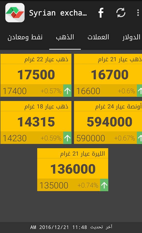 ارتفع غرام الـ 21 ذهب، في دمشق، اليوم الأربعاء، 100 ليرة، بدفعٍ من ارتفاع الدولار محلياً، خلال الأيام الثلاثة الماضية.