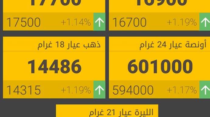 كما أصبح غرام الـ 18 بـ 14386 ليرة شراء، 14486 ليرة مبيع.