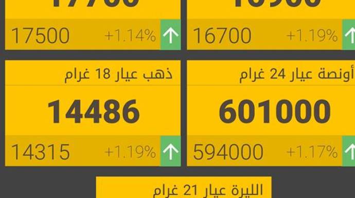 وبقي غرام الـ 21 ذهب بـ 16800 ليرة شراء، 16900 ليرة مبيع.