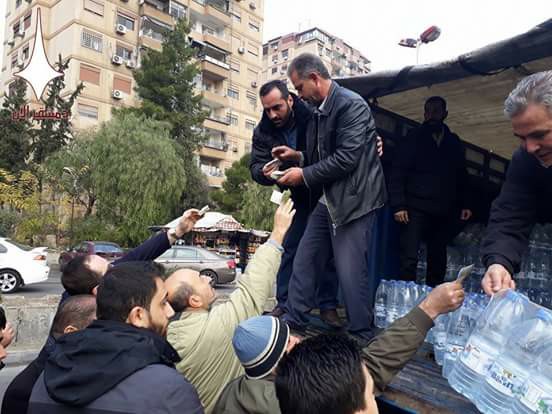 فمنذ خمسة أيام تعاني أحياء العاصمة من انقطاع المياه إلا من ساعات ضخ قليلة تحكمها الواسطة حيث يتمكن الأهالي من تعبئة كالونات الماء للشرب فقط مع حالة ذعر من تلوثها بعد إعلان النظام عن تلوث الماء الواصل من نبع الفيجة، وإنكاره قصف النبع بالبراميل وتحميل الثوار مسؤولية ذلك.