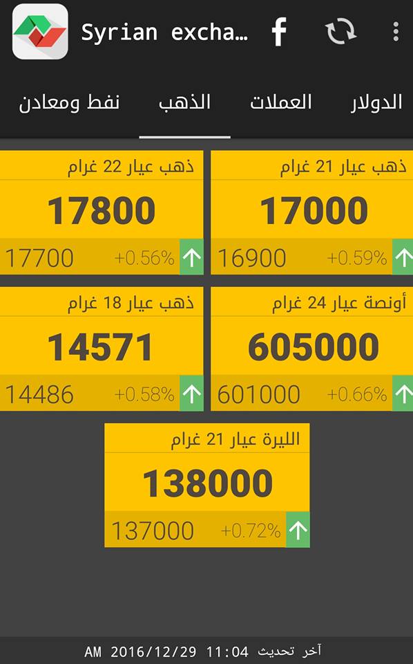 وبقي غرام الـ 21 بـ 16900 ليرة شراء، 17000 ليرة مبيع.