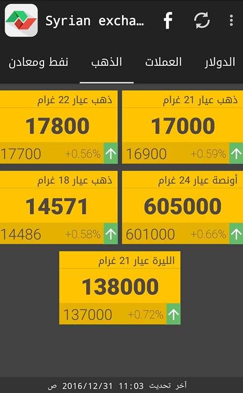 غرام الـ 21 ذهب في دمشق يختم العام 2016 عند 17 ألف ليرة