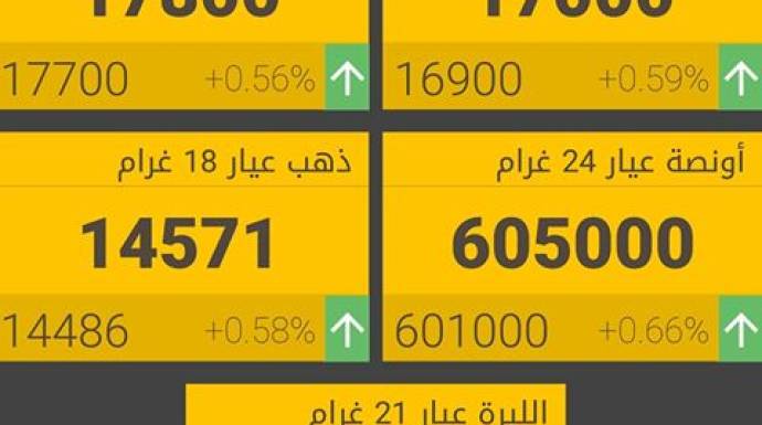 وبقي غرام الـ 21 بـ 16900 ليرة شراء، 17000 ليرة مبيع.
