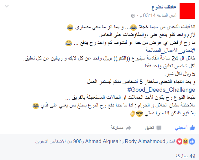 وكذلك قام عاطف نعنوع، أحد متطوعي فريق ملهم التطوعي، بنشر منشور لا يخلو من روح الدعابة دخل فيه تحدي الأعمال الصالحة بدعوة من أحد أصدقائه حيث وصل عدد الإشعارات على المنشور خلال 24 ساعة 900 إعجاب و200 تعليق و49 مشاركة وجمع مبلغ 1550 ريال سعودي ستذهب لإحدى حملات الفريق لإغاثة النازحين والمهجرين السوريين.