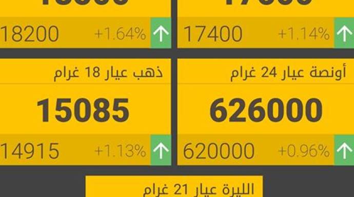 كما بقي غرام الـ 18 بـ 14985 ليرة شراء، 15085 ليرة مبيع.