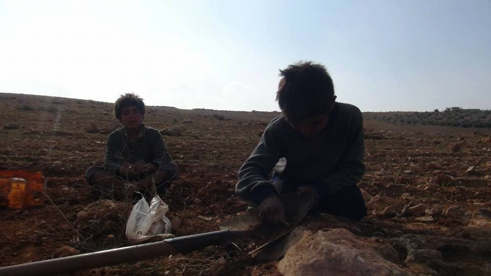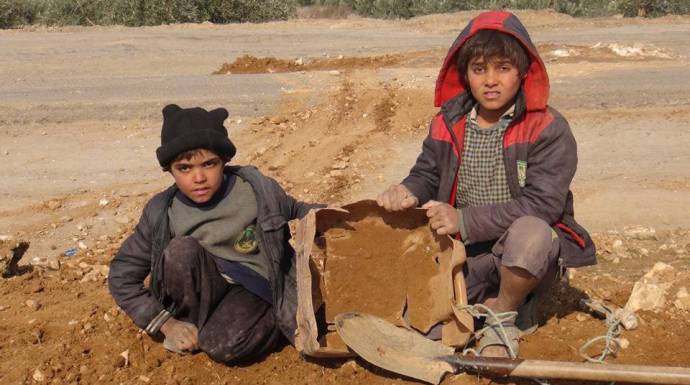 وأظهر شريط فيديو بثته قناة "نبض سوريا" الطفلين وقد حمل أحدهما الرفش وبدأ برفع التراب ووضعه في وعاء بلاستيكي، وبدا الطفل الآخر في مشهد تال وهو يجر الوعاء البلاستيكي ليردم بمحتوياته حفرة كبيرة توسطت الطريق وبديا يعملان بهمة لا تعرف الفتور.