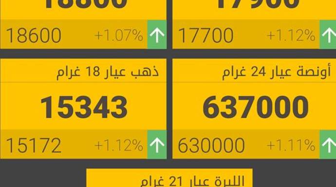 كما بقي غرام الـ 18 بـ 15243 ليرة شراء، 15343 ليرة مبيع.