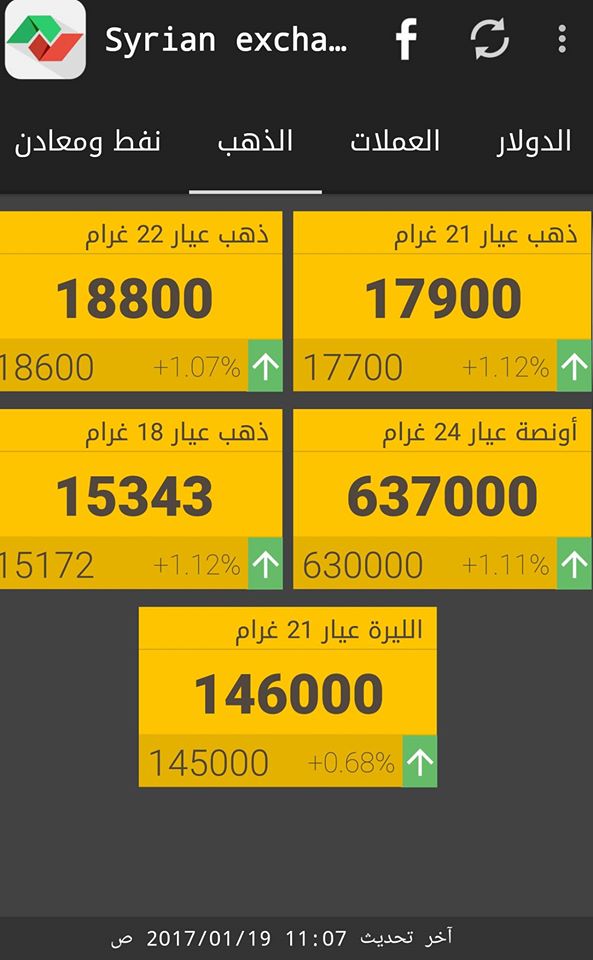 كما بقي غرام الـ 18 بـ 15243 ليرة شراء، 15343 ليرة مبيع.