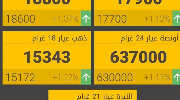 كما بقي غرام الـ 18 بـ 15243 ليرة شراء، 15343 ليرة مبيع.