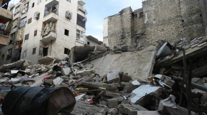 يبدو هذا الشارع وكأنه شهد زلزالا حيث توجد به بناية مقصوفة في حي كان خاضعا لسيطرة المعارضة السورية شمال شرق حلب وأصبح مهجورا عدا شقة في الطابق الثاني من البناية.