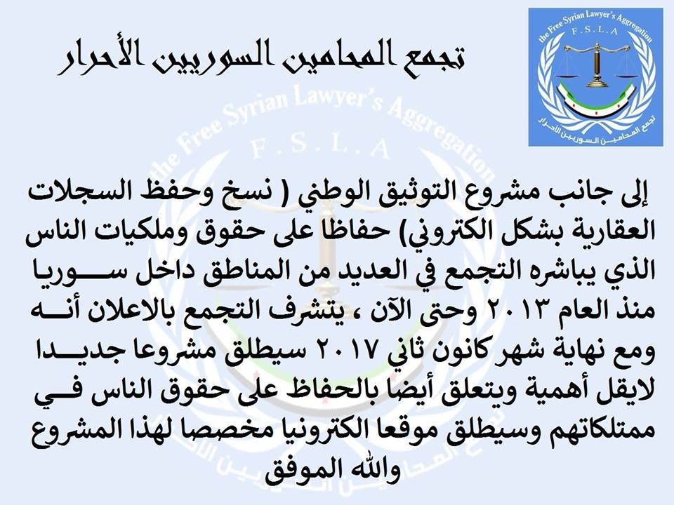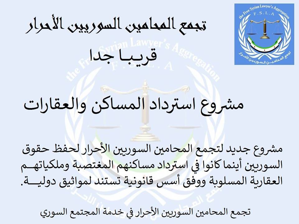 تجمع "المحامين السوريين الأحرار"، وبدعم من منظمة "اليوم التالي"، أطلق مشروع "استرداد العقارات"، والذي يهدف من خلاله إلى الحفاظ على حقوق السوريين في ملكياتهم العقارية والسكنية التي هُجّروا منها أو اغتُصبت منهم أو تركوها بسبب الأوضاع العسكرية، سواء كانت في مناطق النظام أو الواقعة خارج سيطرته.