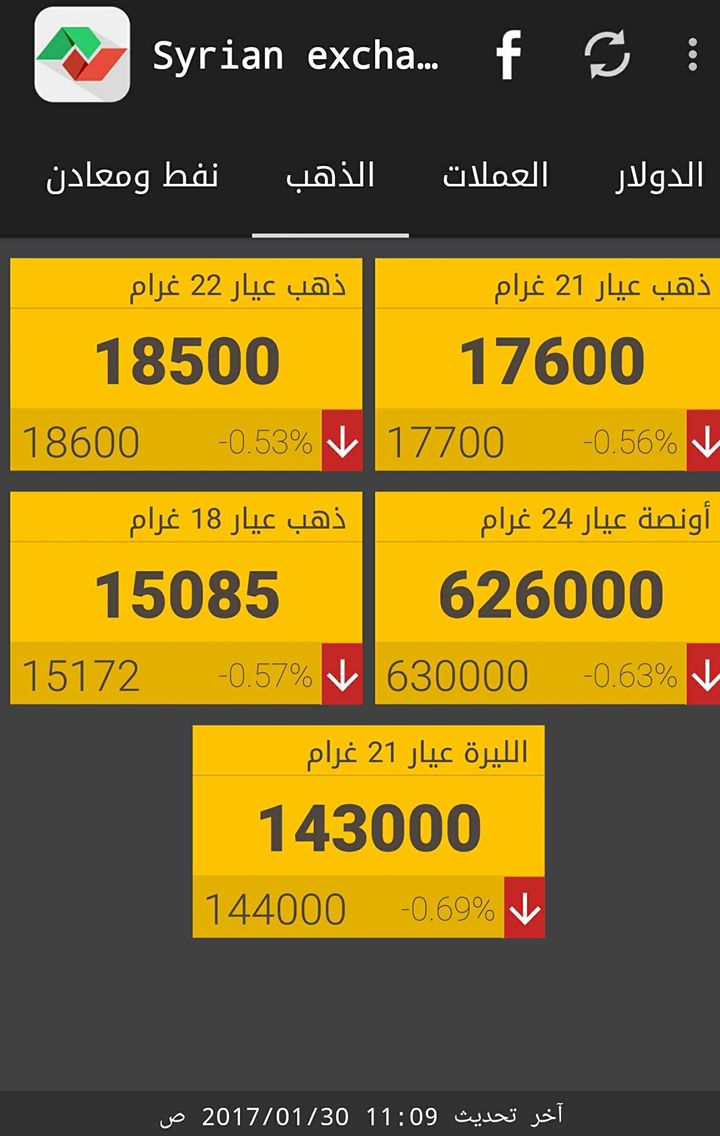 كما بقي غرام الـ 18 بـ 14985 ليرة شراء، 15085 ليرة مبيع.