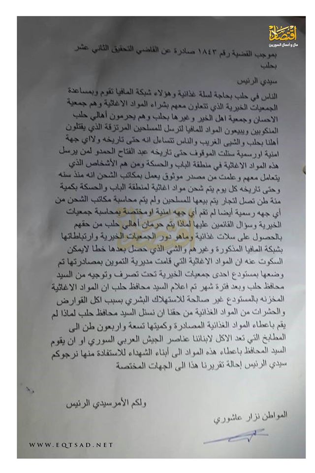 وبيّنت الوثيقة التي تعود إلى عام 2015، والتي حصل عليها "اقتصاد" من مصادر خاصة، أن أحد سكان حلب ويدعى، نزار عاشوري، قام بإرسال رسالة إلى "رئيس الجمهورية بشار الأسد"، يشرح فيها بالتفصيل وبالأسماء والوقائع، الأشخاص الذين وصفهم بأنهم يتاجرون بالمعونات الإغاثية في حلب، وتواطئ الجهات المعنية مع هذه "المافيات" وغض الطرف عنهم، حسب وصف كاتب الرسالة.
