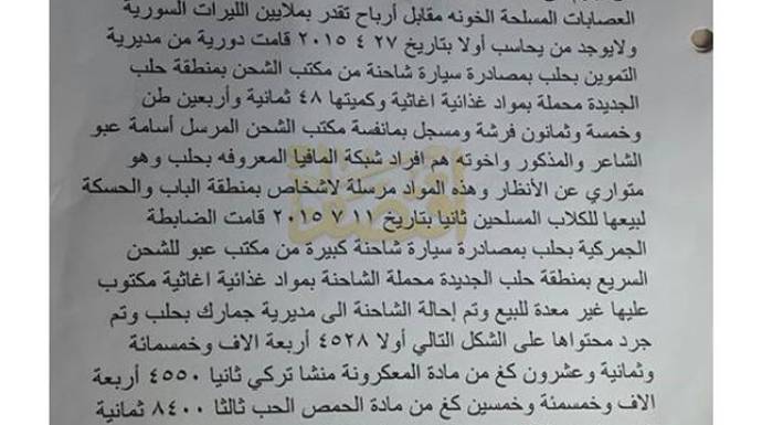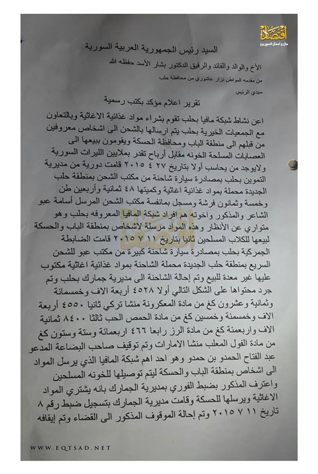 وأوضح كاتب الرسالة، أنه بتاريخ 27/4/2015، قامت دورية من مديرية التموين في محافظة حلب بمصادرة سيارة شاحنة من مكتب الشحن في منطقة حلب الجديدة محملة بمواد إغاثية وكميتها 48 طناً وثمانون فرشة مسجلة بأنها مرسلة باسم أسامة عبو الشاعر، مشيراً إلى أن المذكور وأخوته هم أفراد عصابة المافيا في حلب، وأنهم كانوا بصدد إرسال تلك المواد إلى ما أسماها بـ "العصابات المسلحة" في الباب والحسكة.