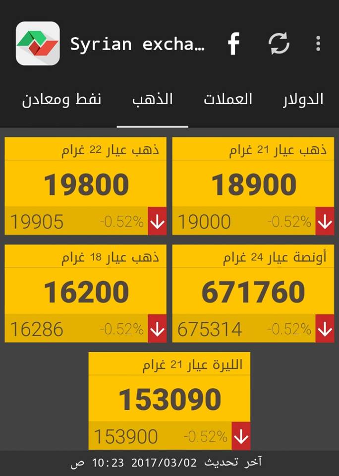 وفيما يلي أسعار أوزان الذهب حسب "سيرياستوكس":