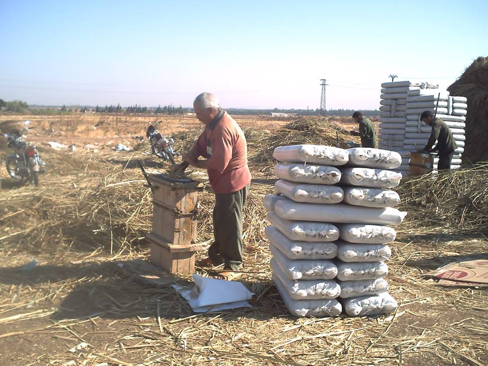 ويختص الرجال-كما يقول كنعان- بتعبئة القش وترصيصه لأنه يحتاج إلى قدرات عضلية، أما النساء فيقتصر عملهن على جمع القش وخياطة المسند.